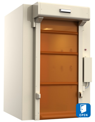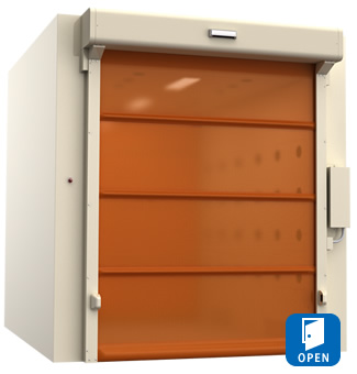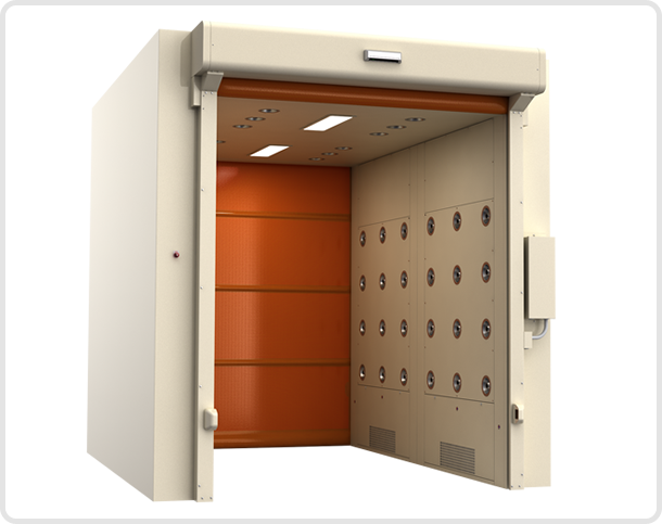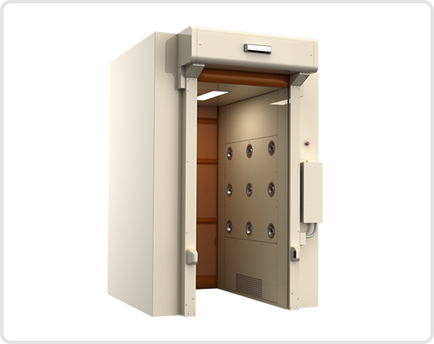 出入り口のドアに、高速シートシャッターを採用したエアシャワーです。余分な設置スペースを必要としません。自動ドアタイプに比べて、シートシャッターは上下に移動するため、また、開閉時間が短く入室しやすい特長があります。