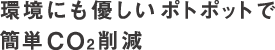 地球温暖化防止は人類共通の課題です。ポトポットの使用によって、地球温暖化の原因となるCO2排出量を削減します。また、ポトポットの商品企画から製造・販売・物流・リサイクルに至るすべてのプロセスでCO2排出量削減に取り組んでいます。